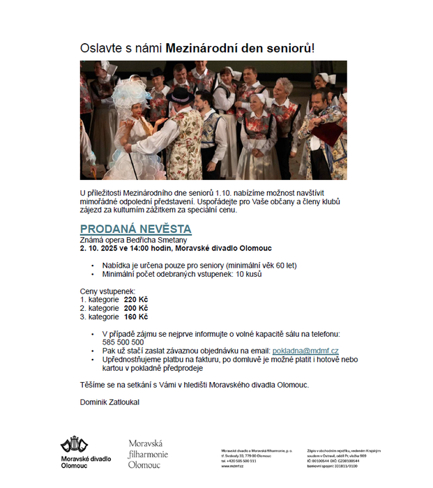 U příležitosti Mezinárodního dne seniorů 1.10. Vám nabízíme možnost navštívit mimořádné odpolední představení Moravského divadla
