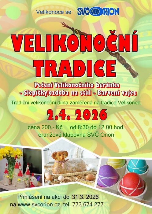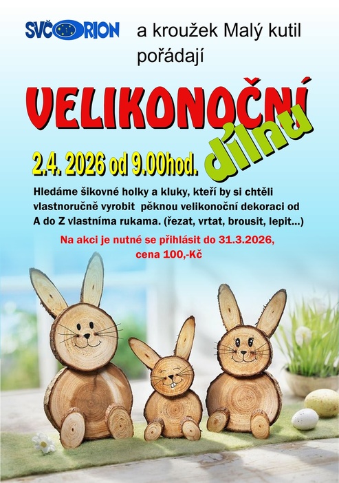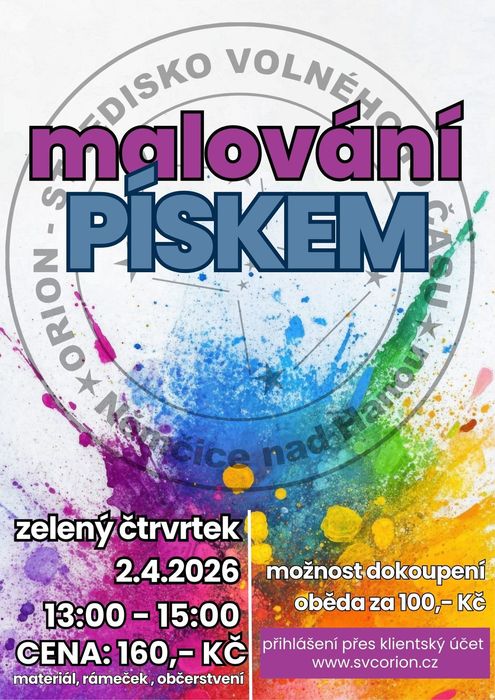 ORION - Středisko volného času připravuje pro děti program na velikonoční prázdniny - zelený čtvrtek 2.4.2026. Dopoledne nabídne dvě rukodělné dílny, buď řemeslnou nebo kulinářskou a odpoledne pak malování pískem. Na všechny aktivity velikonočního programu je nutné se nahlásit dopředu. Více informací najdete na našem webu www.svcorion.cz.