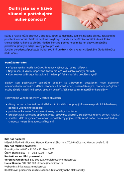 Úvod > Aktuality > Poskytování služeb - sociální poradenství Němčice nad Hanou