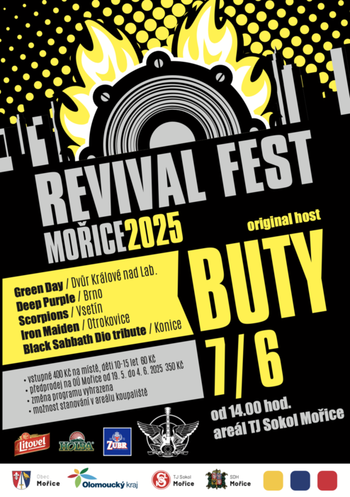 V sobotu 7. června od 14 hodin se v areálu TJ Sokol Mořice uskuteční Revival Fest Mořice 2025. Vystoupí revivalové kapely – zazní hity skupin Green Day, Deep Purple, Scorpions, Iron Maiden, Black Sabbath a jako originální host vystoupí skupina Buty!
