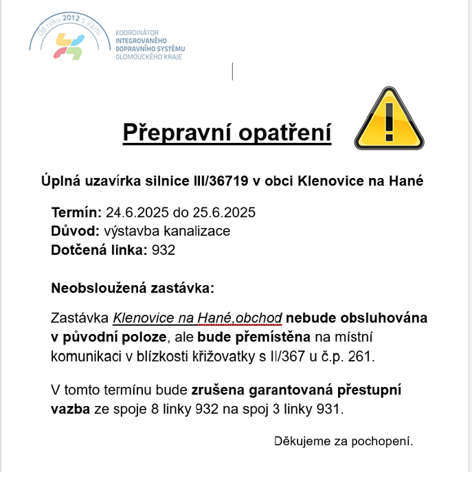 Bližší informace o uzavírce včetně popisu změn ve vedení autobusové dopravy v průběhu jednotlivých etap naleznete zde: https://www.idsok.cz/vyluky/uplna-uzavirka-silnice-iii-36719-v-obci-klenovice-na-hane/.