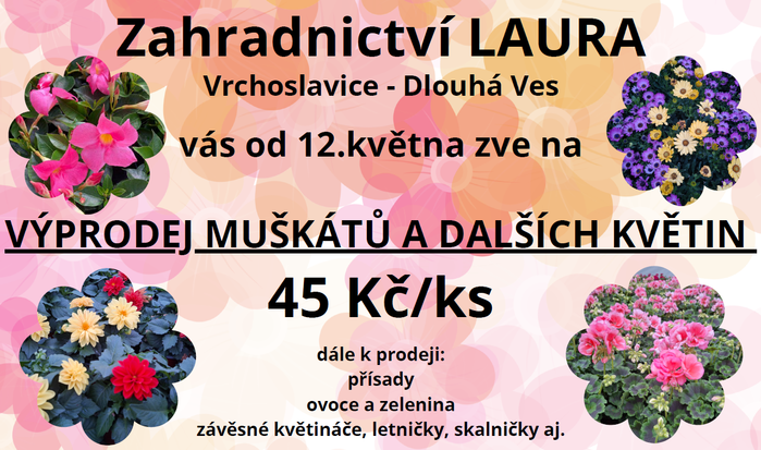 Zahradnictví Laura Vrchoslavice - Dlouhá Ves Vás zve na doprodej květin: 45,-Kč/ks - muškáty, jiřiny, ostea, begonie, multipack po 10 ks - 80,-Kč, přísada 3,-Kč/ks, sazenice paprik, rajčat, cuket, patisonů, dýní - 20,-Kč + další sortiment.