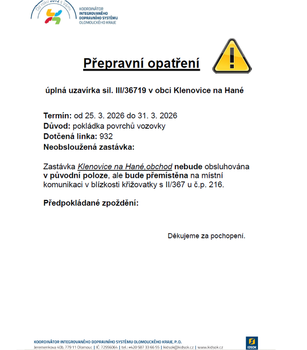 Úvod > Aktuality > Změna termínu - Uzavírka: Úplná uzavírka sil. III/36719 v obci Klenovice na Hané