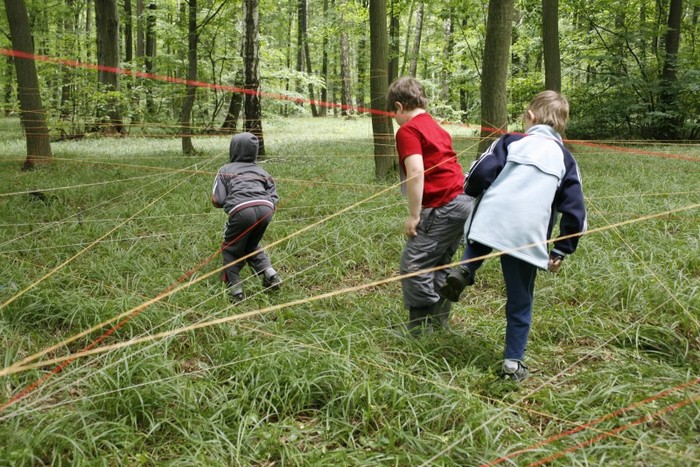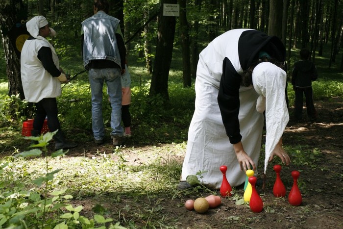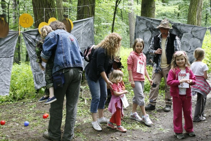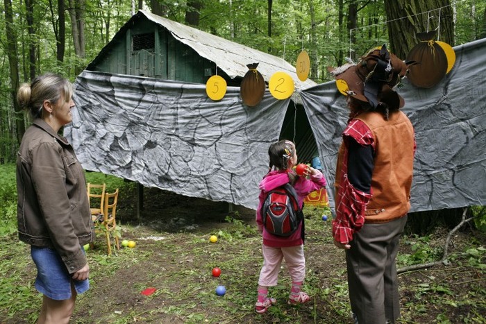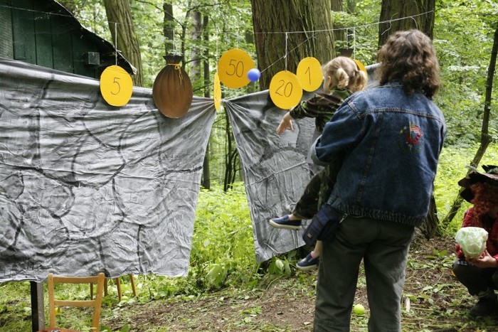 Děti hází míčkem do měšců